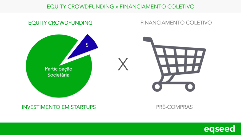 Resumindo, a diferença entre equity crowdfunding e financiamento coletivo é que usuários de plataformas de equity crowdfunding são investidores, em vez de consumidores e apoiadores de um produto. Essas pessoas investem em startups pelo mesmo motivo que elas investem em empresas na Bolsa de Valores. Elas procuram retornos financeiros com o objetivo de crescer seu patrimônio junto com a empresa investida, para atingir rentabilidade no futuro. É bom lembrar que investimento em empresas startups é de risco elevado e longo prazo e, portanto, deve compor apenas uma parte de uma carteira diversificada de investimento (no máximo 10%). Apesar disso, investimentos feitos por meio de plataformas de equity crowdfunding oferecem a possibilidade de grandes retornos, caso a empresa obtenha sucesso.